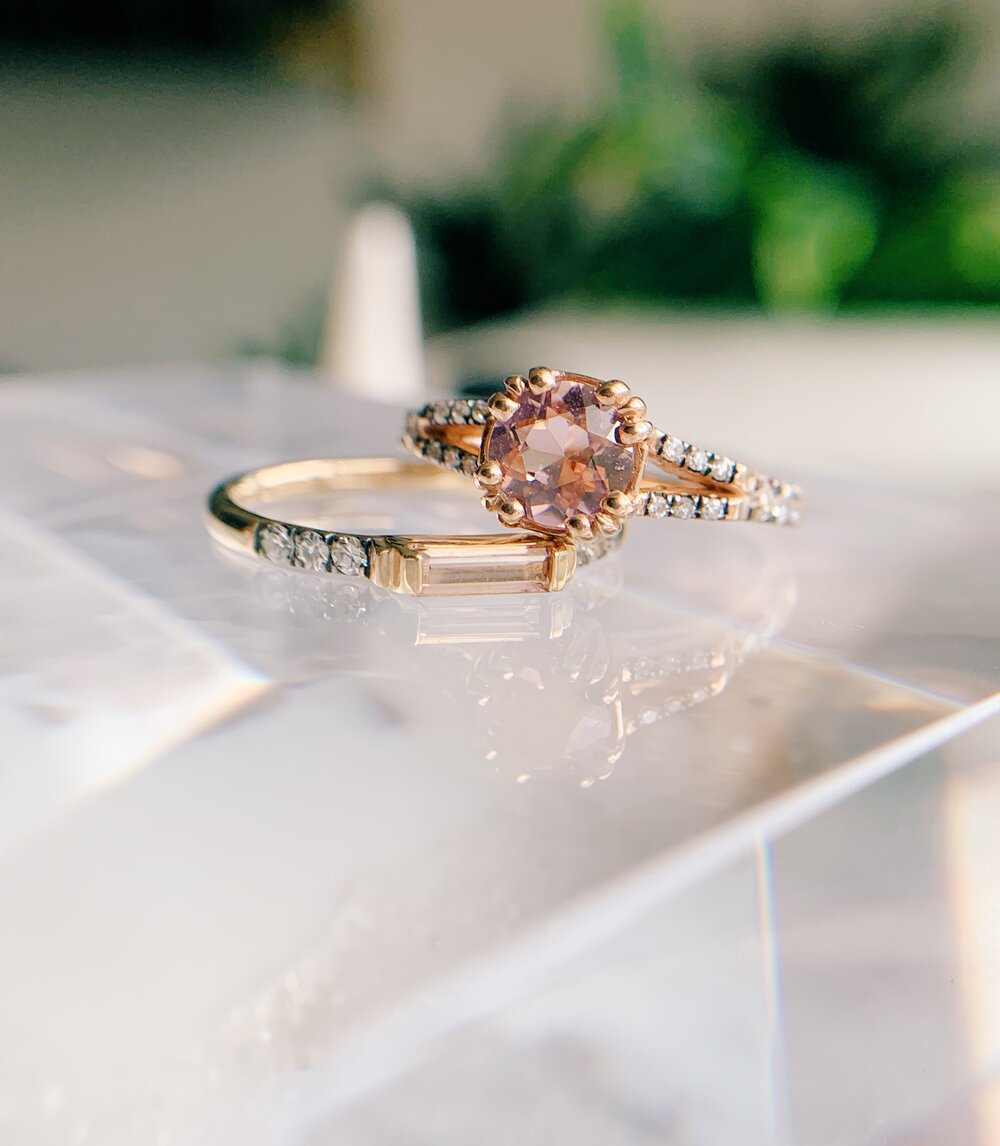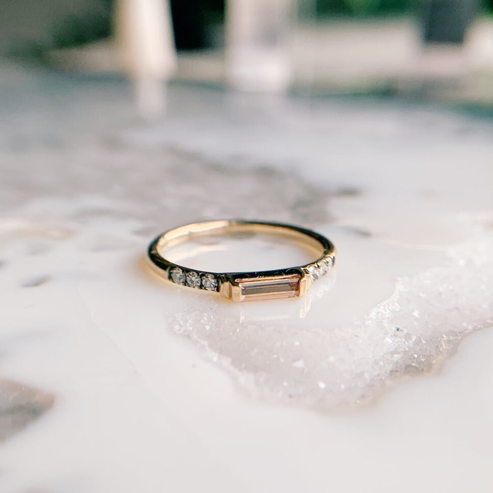 14k rose gold ring with Peach Tourmaline ring with 2mm x 6mm baguette custom cut Peach Tourmaline gemstone (0.2-0.3 ct), and pavé of white diamonds (0.12 ctw)