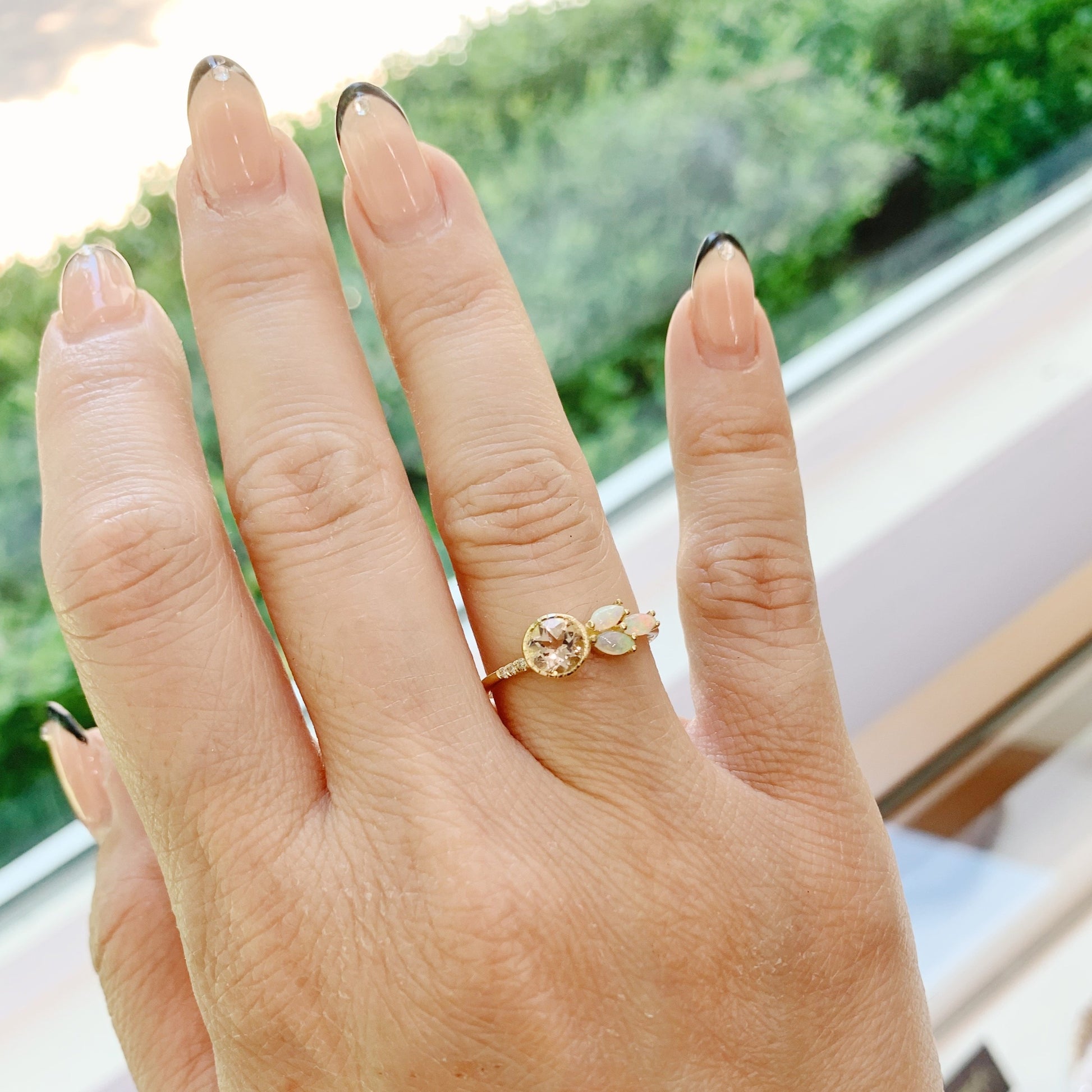 5 mm morganite, three 4 x 2 mm Australian opals, three 1 mm diamonds, milgrain detail, 1.3 mm round shank