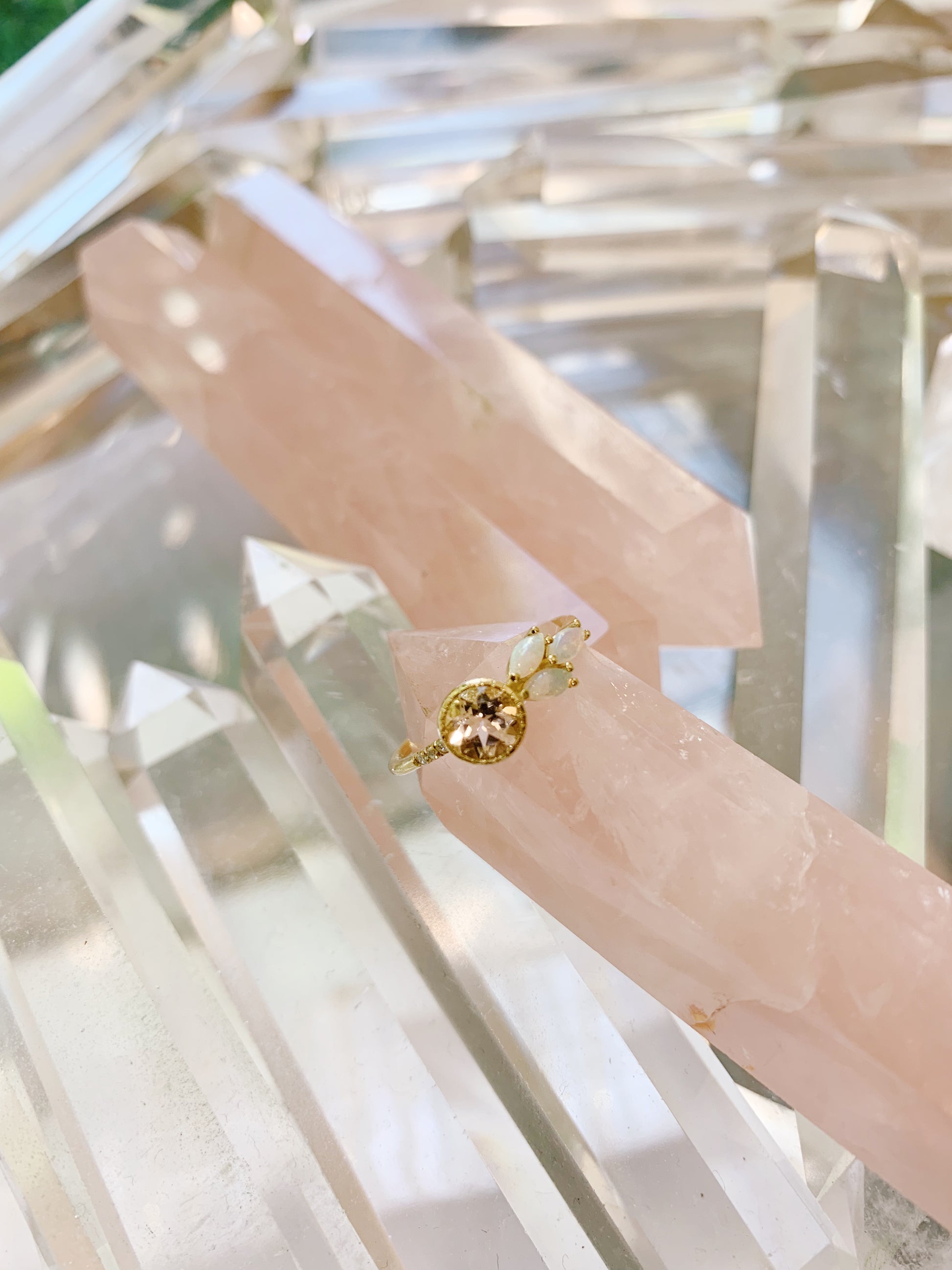 A delicate and feminine piece that feels like poetry. We love the harmony of a water colored morganite, set alongside Australian opals which flash hues of blue, pink and green, and topped off with three diamonds. It all sings so well together.