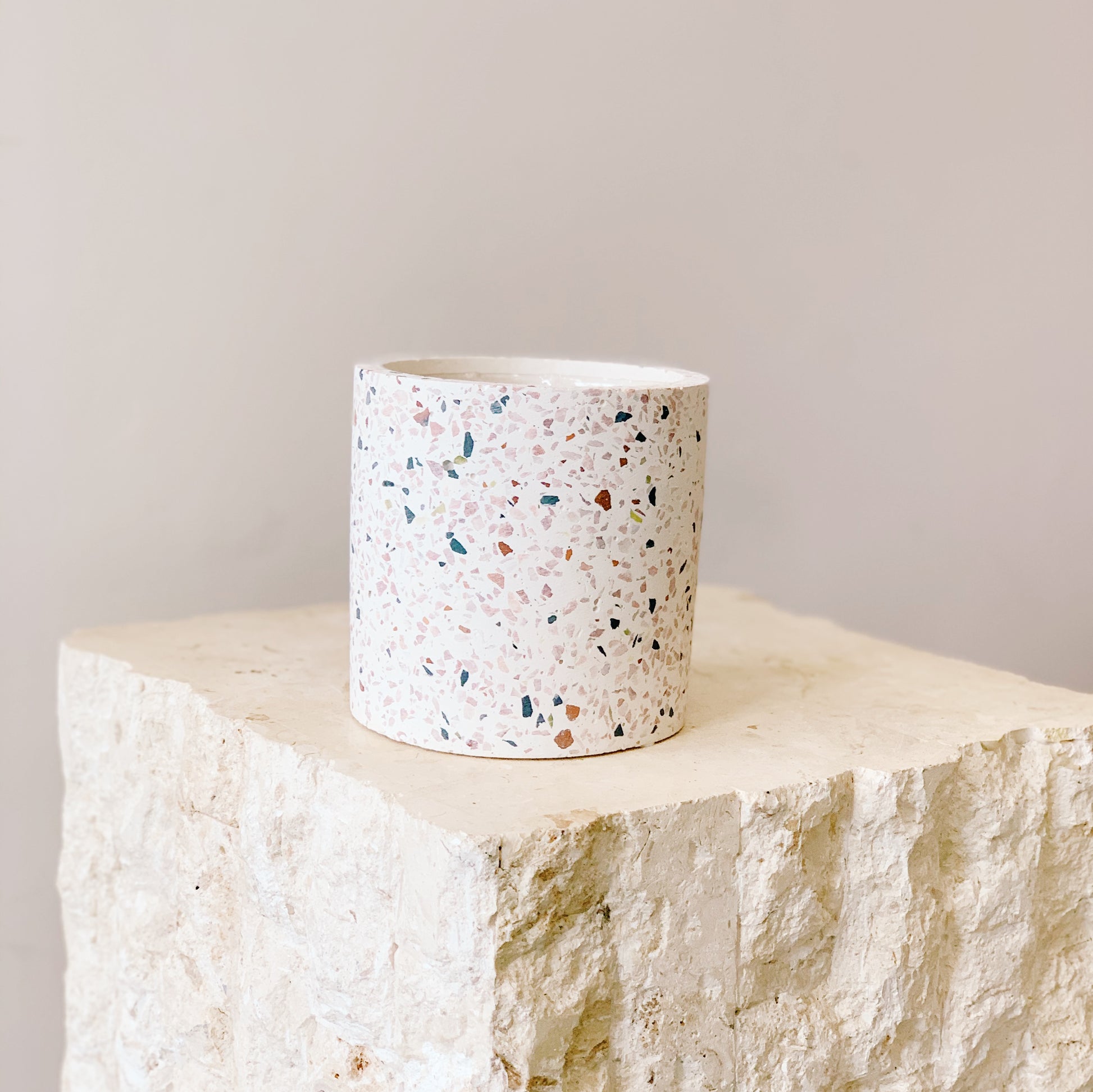 Give your greenery a fresh place to rest with this terrazzo planter. Simple cylindrical build features a spontaneous mosaic of terrazzo sprinkled allover.